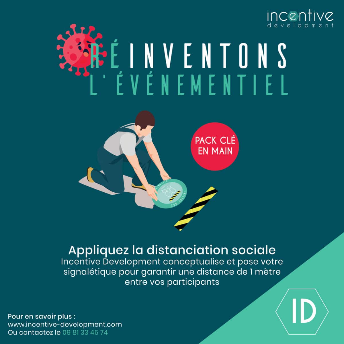 Notre conseil : En 2021, pour l’organisation d’évènements hybrides ou présentiels, le respect des distances et des gestes barrières se matérialisent par la disposition de marquage au sol ou de sticker.
